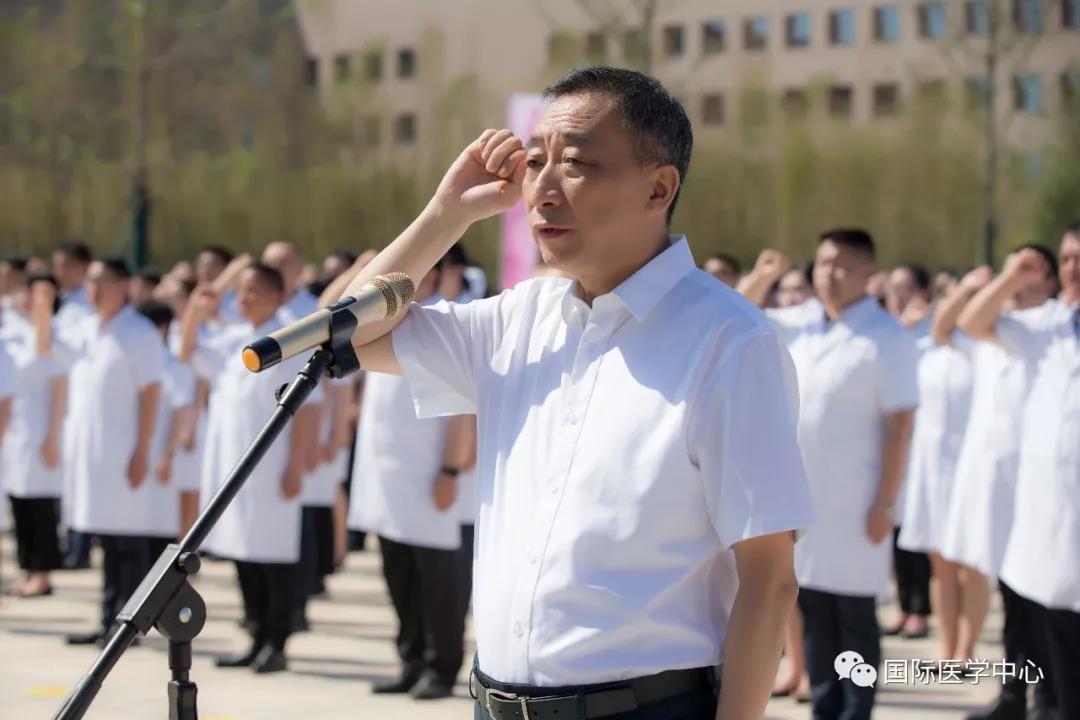 儀式開始,王志峰總經理發表了熱情洋溢的致辭,歡迎來自五湖四海的各位醫療及醫療保障工作者們,并祝賀大家成為西安國際醫學中心的開拓者、創業者。他表示,經過近一年的密集籌備、人員引進,我中心首批員工到崗,其中學科帶頭人和骨干來自全國知名三甲醫院,可謂人才濟濟,精英薈萃,具備揚帆遠航的實力。全體員工是西安國際醫學中心建設的基石、發展的核心動力。合格的國際醫學人,應該是以至善之心博愛天下,以服務社會積微致遠。秉承讓“患者有尊嚴的生活,醫者有尊嚴的工作”的價值觀,珍惜機遇,牢記誓言,不忘初心,砥礪前行。匯聚人類生命科學智慧,同步國際頂尖診療水平。為了一個共同的目標凝聚一起,共同“佑護無法衡量的價值”!