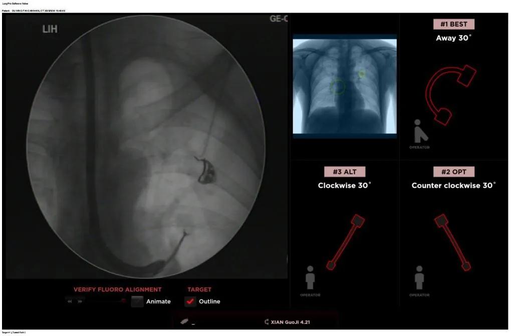 經過充分的討論后,歐陽海峰副院長決定為患者實施LungPro全肺導航系統引導的經支氣管跨肺實質肺外周結節活檢術。Broncus導航系統LungPro具有全球領先獨創的BTPNA技術(支氣管鏡下跨結節抵達術),可以實現對氣道外周孤立性肺小結節的精準定位,建立直接通往氣道外病變部位的通道,以實現全肺的診斷及后續治療。這項技術不僅彌補了現有支氣管鏡技術由于受限于病變部位是否有氣道可通向以及無法準確定位病變部位而造成的較低診斷率,同時還彌補了CT引導下經胸穿刺(TTNA)無法適用于某些特定部位如中央及肩胛骨等結節的問題,并且還避免了經胸穿刺給患者帶來氣胸、出血的高風險,可有效提高肺部結節及早期肺癌診斷陽性率,亦可用于早期肺癌的射頻消融或微波治療,具有微創、安全、同期雙肺診療等優勢。