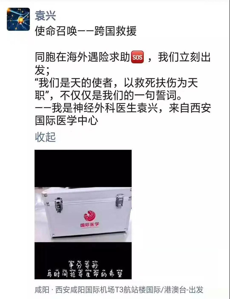 一場由網友自發的愛心接力,在網絡上、朋友圈中傳播,大家伸出援手,將愛心匯聚成暖流,小高母親的病情也牽動著西安國際醫學中心醫院腦科醫院神經外科主任賀世明的心。12月2日,得知小高一家的處境后,賀世明主任立即報告醫院,在了解了患者的病情和現狀后,經過綜合考慮,醫院迅速啟動首次國際救援,準備了急救藥品、便攜設備,立即派出神經外科袁興醫生連夜出發,前往泰國進行緊急救治,開啟了一場跨國救援的大愛之旅。