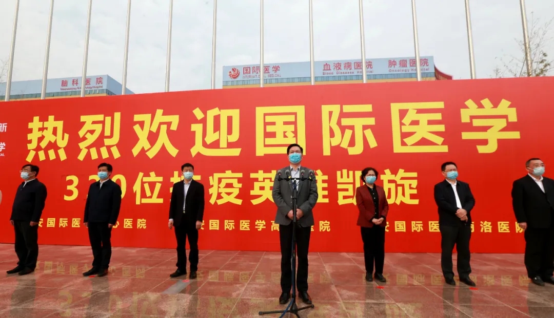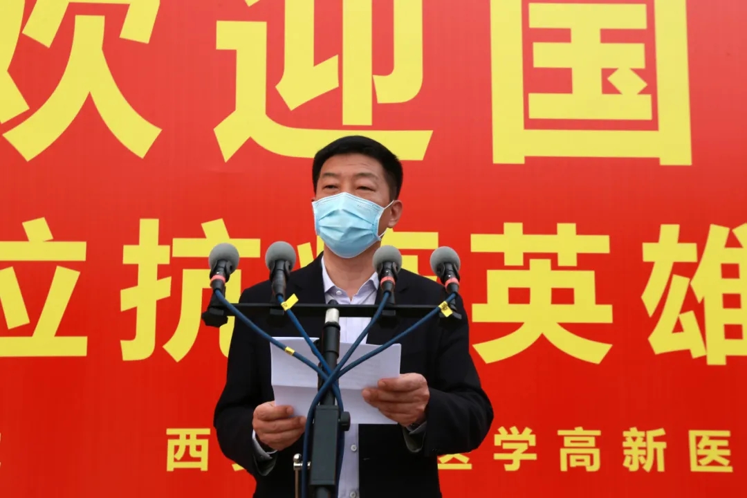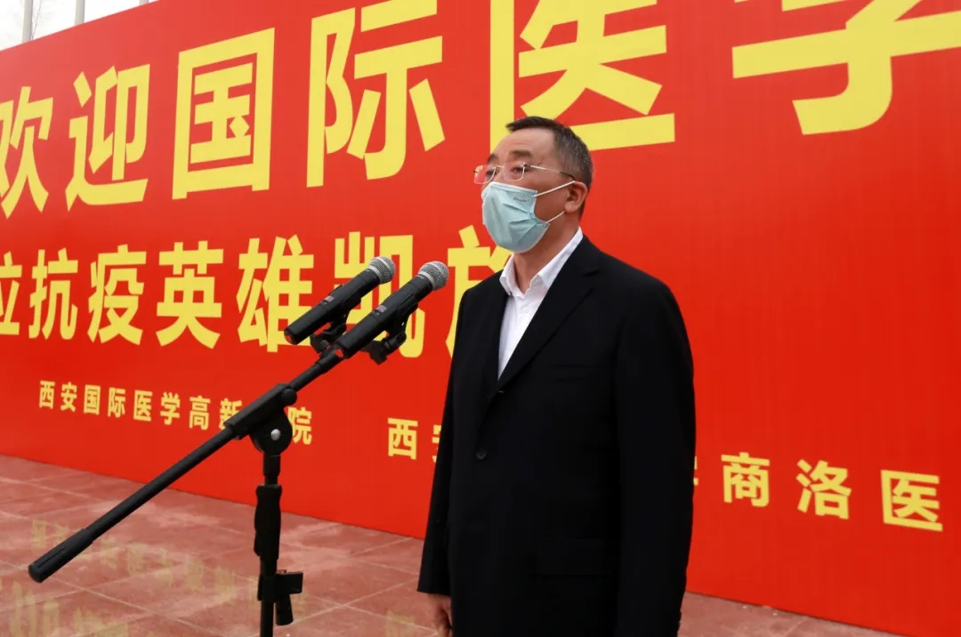 “歡迎回家!”在西安國際醫學中心的萬人廣場,陜西省副省長趙剛,國務院應對新冠肺炎疫情聯防聯控機制綜合組第十二工作指導組組長、國家衛健委人才中心主任、黨委書記張俊華,省衛健委書記劉勤社,省衛健委主任劉寶琴,省衛健委副主任、省保健局局長趙嵐,省衛健委副主任劉嶺,西安市委常委、高新技術開發區黨工委書記、西安民用航天產業基地黨工委書記鐘洪江,國際醫學董事長史今、總裁劉瑞軒、副總裁孫文國、西安國際醫學中心醫院院長尹強等出席歡迎儀式,向醫療隊表示親切的問候,并向他們無畏生死、奮戰一線的精神致敬!