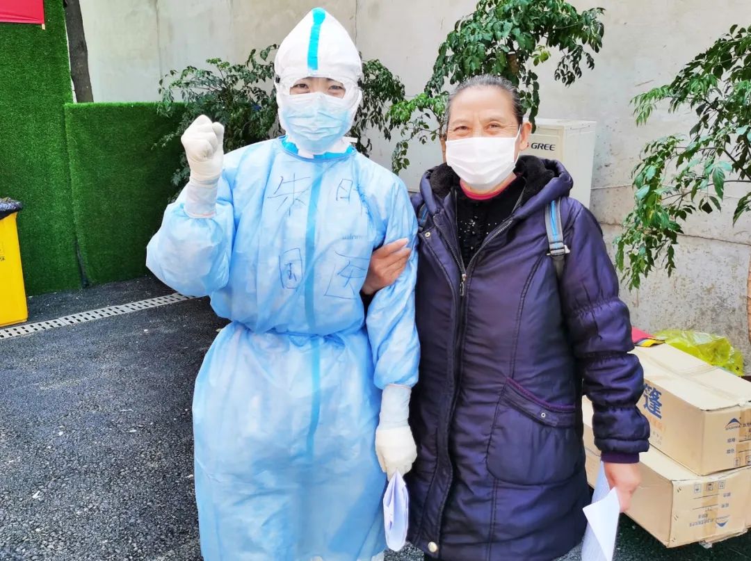 “阿姨你咋還不走呢?”護(hù)士長朱晴看到一位“熟人 ”還站在驛站門口。這位阿姨的老伴兒感染新冠不幸去世,她和兒子都被傳染,從醫(yī)院到康復(fù)驛站后出現(xiàn)了嚴(yán)重應(yīng)激反應(yīng),失眠,哭泣,休息不好,血壓升高,胃口很差。除了關(guān)注阿姨的身體狀況外,朱晴時(shí)常寬慰她,要保重身體和兒子一起回家。“我要和你留個(gè)照片,以后一定要去西安看你。當(dāng)面感謝你們醫(yī)療隊(duì)!”阿姨挽著朱晴的胳膊說。