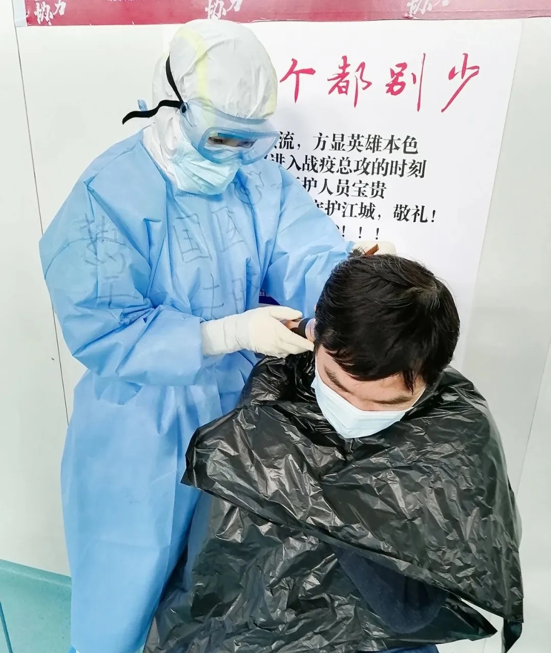 1艙有康復人員想理發,手頭沒有工具,朱晴護士長得知后,聯系下個班次護士帶來推子,給大家理發。“看你動作很嫻熟啊,以前練過的吧”,“圍觀群眾”打趣道。“現學現賣,大家要求不要太高,有壓力啊!”朱晴說。一直推到推子沒電,朱晴給6位康復人員簡單修剪了頭發。得知朱晴是西安醫療隊的護士,大家都親切的稱她“肉夾饃”!