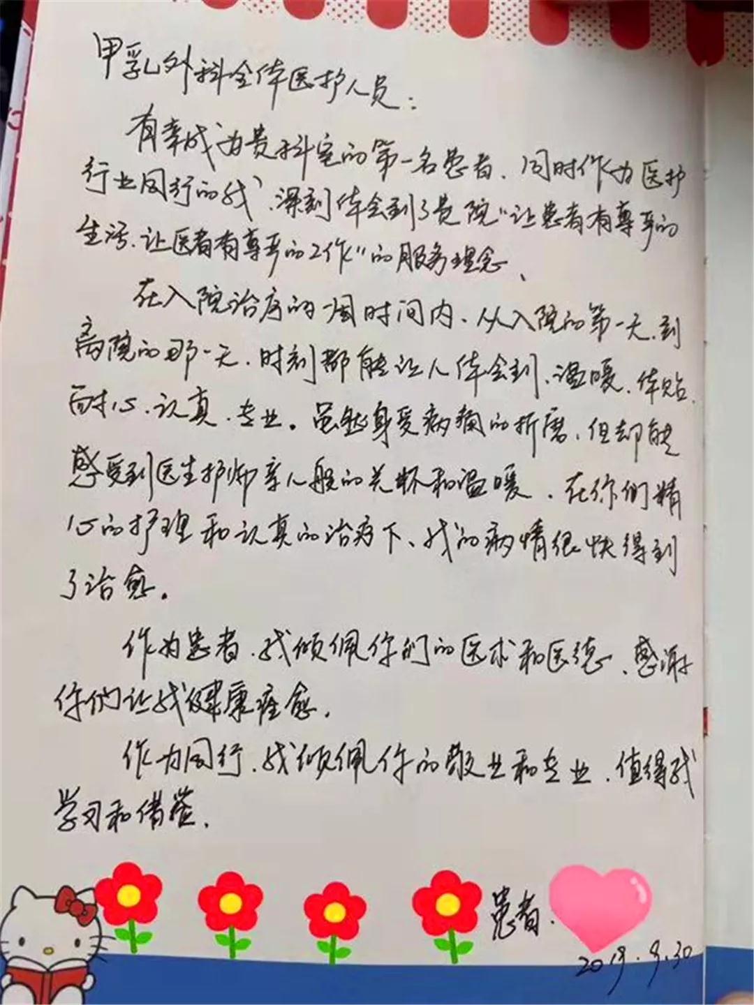 10月1日下午,甲乳外科第一位患者康復出院了!甲乳外科劉曉敏主任及科室醫護人員在患者住院期間,依靠專業的治療及精心的護理,讓患者感受到了親人般的關懷和溫暖,病人很快得到康復出院。