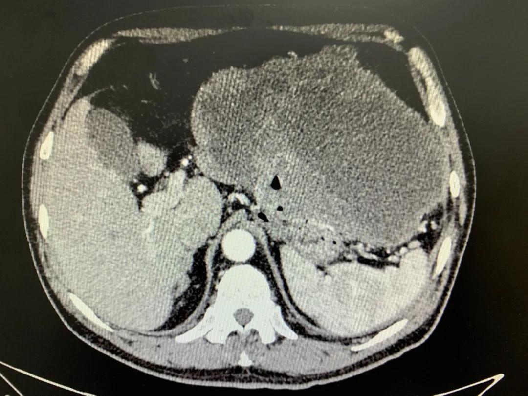 患者入院時(shí)血紅蛋白數(shù)值仍持續(xù)下降,出現(xiàn)失血性休克表現(xiàn),危及生命。消化外科二病區(qū)蔡磊主任接診后,組織科室迅速對患者進(jìn)行了全面的檢查。CT提示腫瘤大小約19.3*10.3cm,腫瘤內(nèi)提示大量積血。結(jié)合相關(guān)檢查,考慮為罕見的巨大胃間質(zhì)瘤合并出血。