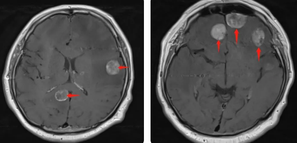 無獨有偶,60歲的左肺癌患者石先生,在外院接受了手術(shù)治療,結(jié)果術(shù)后10月出現(xiàn)腫瘤腦轉(zhuǎn)移,頭部增強MRI顯示:顱內(nèi)多發(fā)占位性病變伴水腫,接二連三的重?fù)糇屖壬霈F(xiàn)表情淡漠,沉默寡言,絕食等抑郁癥狀,VMAT放療技術(shù)與心理疏導(dǎo)雙管齊下,3周的治療后顱內(nèi)轉(zhuǎn)移病灶顯著縮小,部分甚至消失,困擾石先生的頭痛、頭暈癥狀也不復(fù)存在,石先生重拾對生活的希望,也對未來的治療充滿信心。