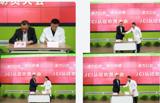 尹強院長與專科醫院院長、臨床科室、醫技科室、檢驗中心及機關職能部門主任、代表,簽署了《評審目標責任書》。消化病醫院執行院長韓國宏、腫瘤一病區黎冬梅護士長分別發言,一致表示,一定積極參與、配合、支持相關工作,為我院順利通過JCI認證工作全力以赴!