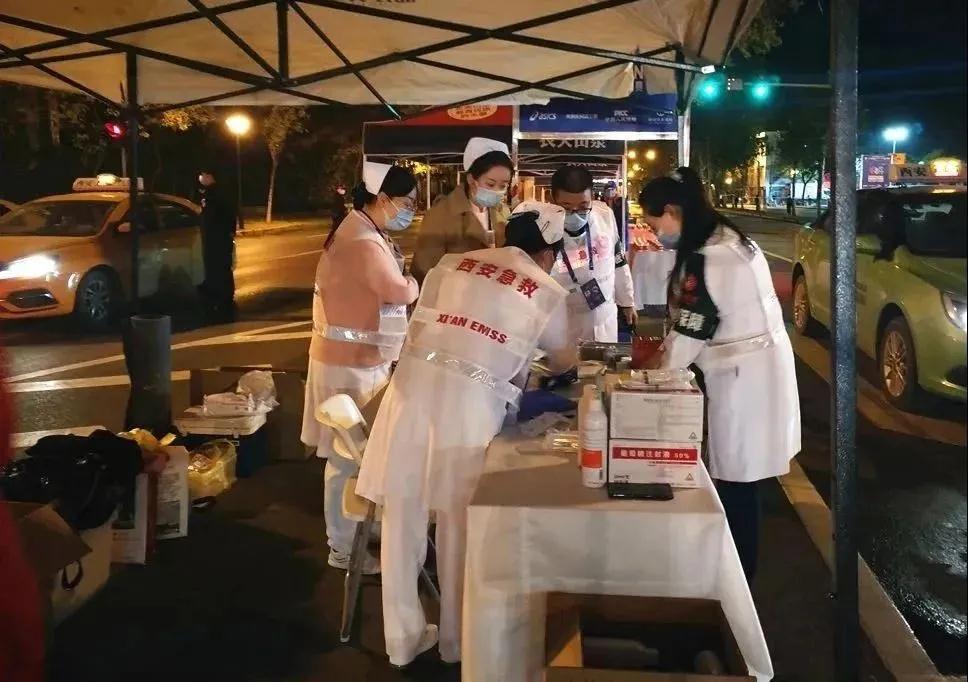 凌晨4點,醫療保障組分成3隊,分乘4輛車從醫院統一出發前往賽事現場。到達指定地點后,團隊立刻按照前期演練分工進行相關準備工作。7點30分,2020西安國際馬拉松正式鳴槍開跑,現場保障人員及時響應,積極救助受傷參賽選手,專業的技術和溫馨的言語,讓受傷的的選手們感到溫暖。