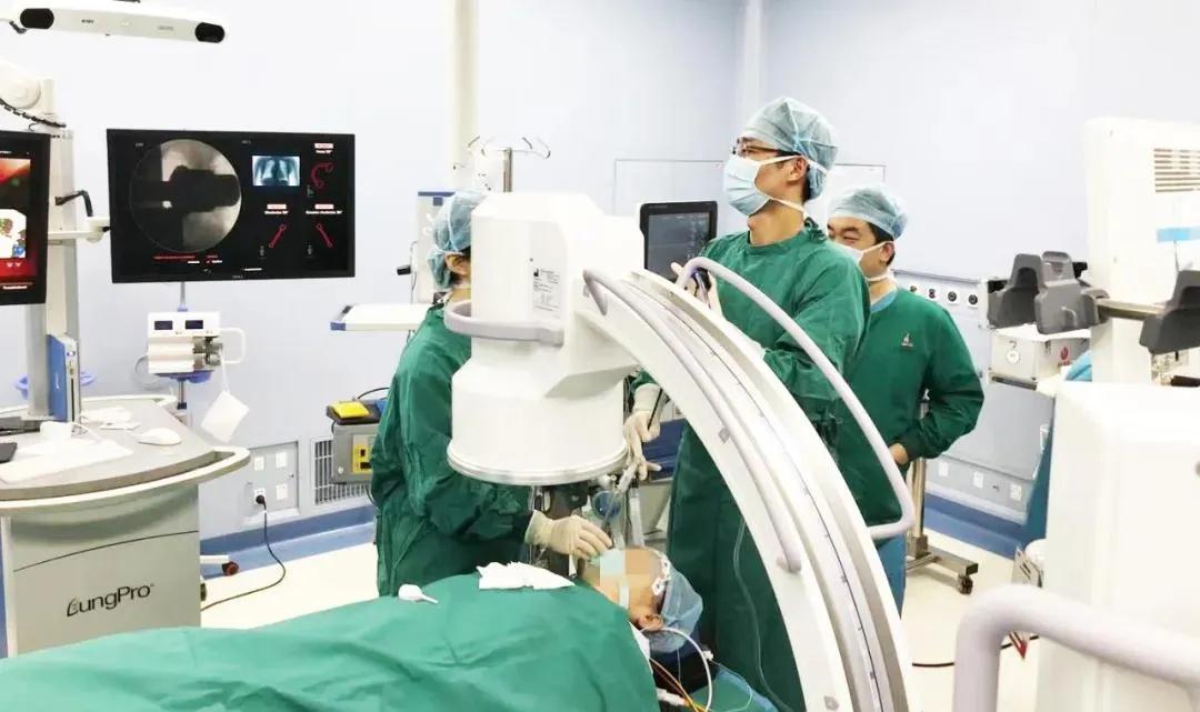 4月13日,在呼吸介入室,歐陽海峰為患者全麻下行鞘管引導的經支氣管鏡冷凍肺活檢術(GS-TBLC)。術中,他將鞘管引導的環掃超聲技術與TBCB技術結合起來,同時預置止血球囊,極大降低了患者大出血的風險。半個小時的手術非常順利。