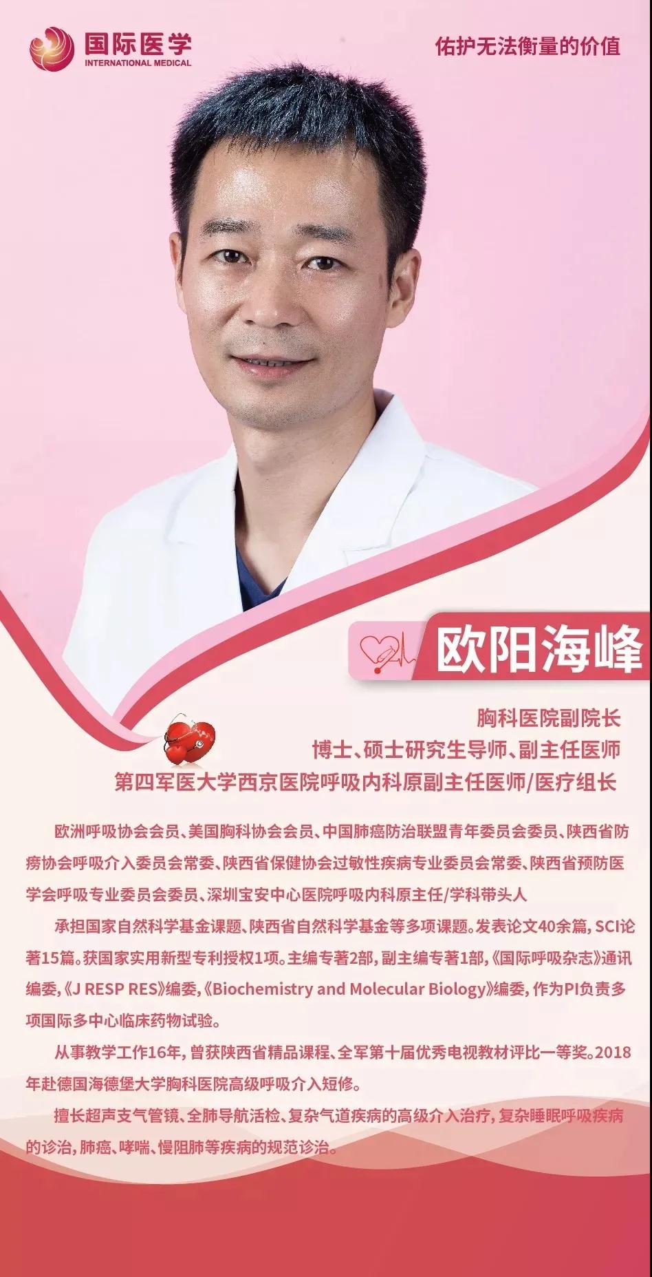 他叫歐陽海峰,中國肺癌防治聯盟青年委員會委員、陜西省醫師協會微無創醫學專業委員會常委、西安國際醫學中心醫院胸科醫院副院長。