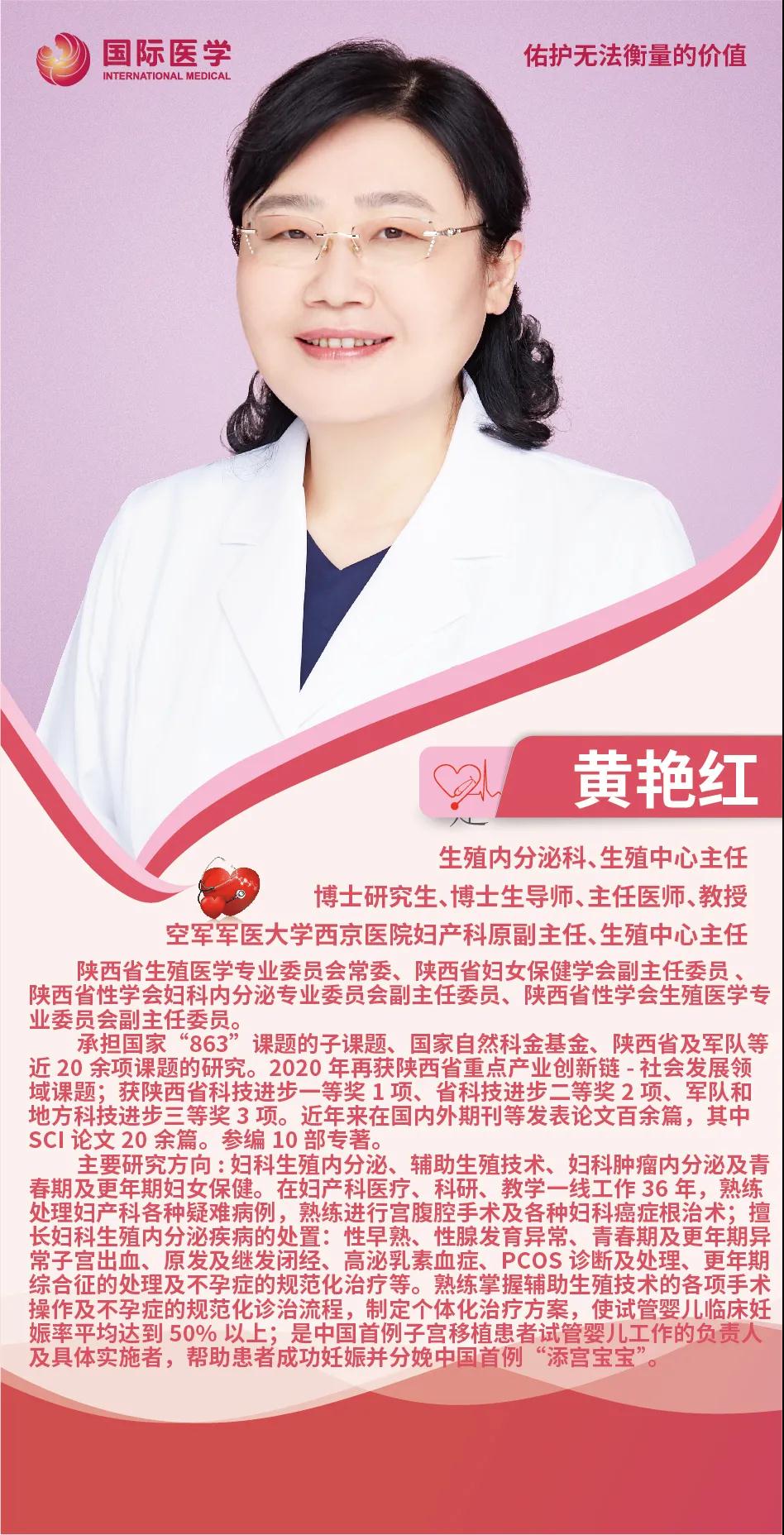 黃艷紅,西安國際醫學中心醫院生殖內分泌科主任,醫學博士、博士生導師、主任醫師、教授,第四軍醫大學西京醫院婦產科原副主任、生殖醫學中心主任,陜西省生殖醫學專業委員會常委,陜西省婦女保健學會副主任委員,陜西省性學會婦科內分泌專業委員會副主任委員,陜西省性學會生殖醫學專業委員會副主任委員。