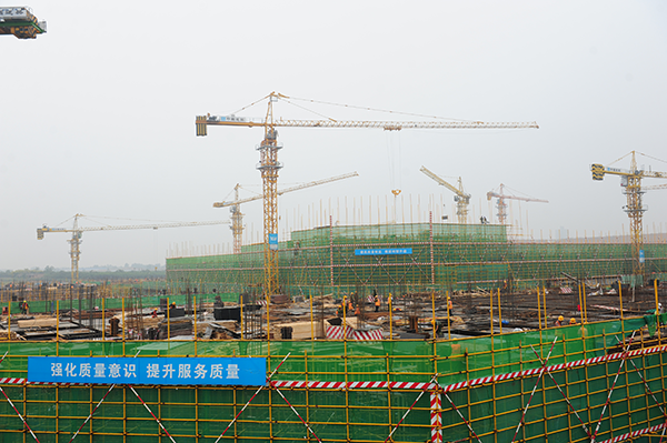 隨后李毅一行在史總帶領下,來到工地現場的二層觀景平臺,面對規模宏大,塔吊林立的建筑現場,看到項目整體浮出地面,中心醫技樓已建至二層,李書記對項目建設進度表示驚喜,同時對建設管理表示肯定。期間,史總結合施工現場和效果圖為李書記詳細介紹了國際醫學城的建設架構,功能劃分等情況,之后還就規劃建設的“一心兩翼 天使之城”健康中國小鎮的設計理念,“五位一體”功能布局等做了詳細介紹和說明。