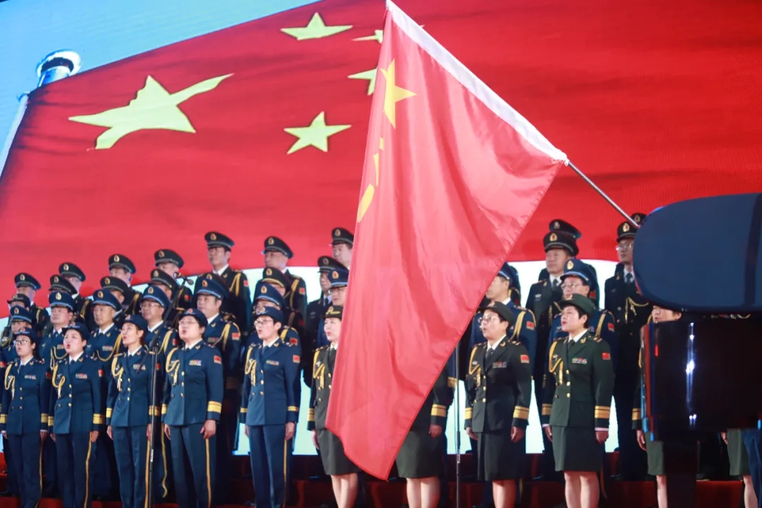 “我是一個兵,來自老百姓……”合唱將《我是一個兵》《沒有共產黨就沒有新中國》巧妙編排在一起。《我是一個兵》鏗鏘有力,氣勢高亢,展示了老兵們永不褪色的軍人風采;隨著中國人民解放軍進行曲響起,三名軍旗手,邁著堅實的步伐走上舞臺;“沒有共產黨就沒有新中國,沒有共產黨就沒有新中國……”激情高昂的歌聲表達出每一個人的心聲,合唱融入了京劇唱法,男聲鏗鏘有力,氣勢十足,女聲委婉細膩,優美動聽,極富有感染力,將整場氣氛推向高潮,贏得全場陣陣掌聲。