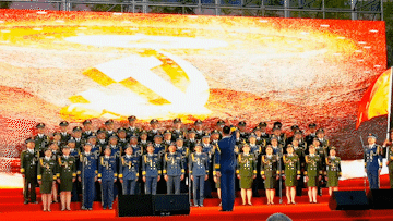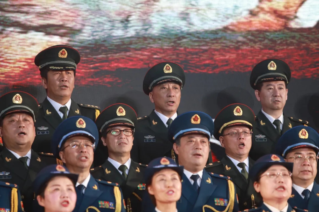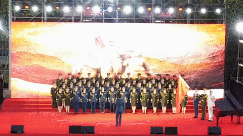 “一二一”,演出開始,由71名退役軍官組成的退役軍人合唱團,在尹強院長的帶領下,邁著整齊的步伐,喊著響亮的口號,雄赳赳,氣昂昂走上舞臺。