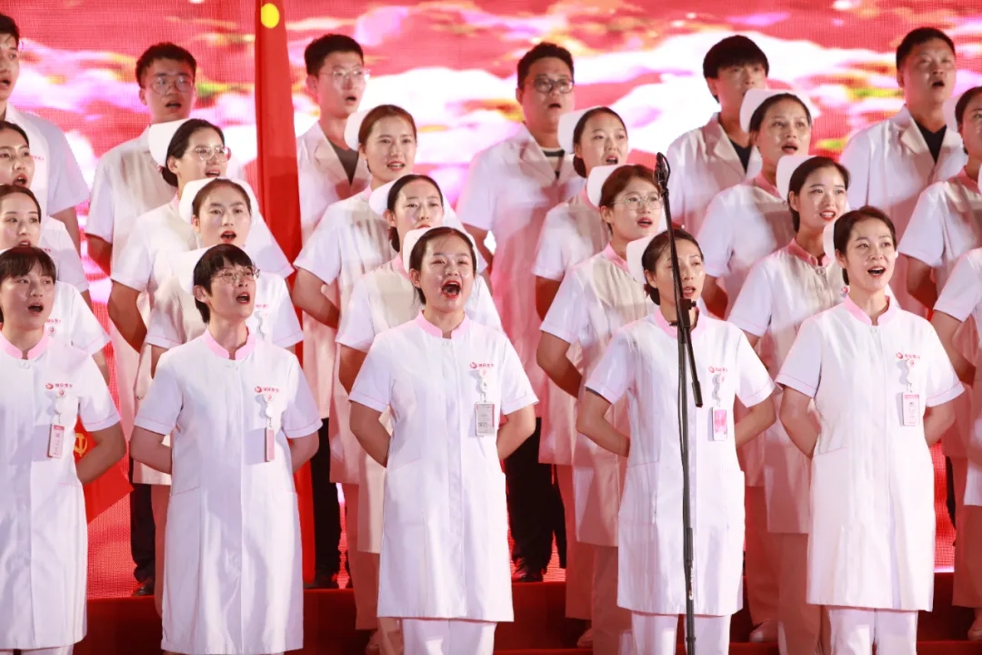 “夜半三更喲盼天明,寒冬臘月喲盼春風……”合唱團用歌聲抒發對偉大祖國的深深至愛,傾訴對醫學事業的拳拳之情。在領唱的帶領下,大家分男女聲部進行輪唱,群情激昂,歌聲嘹亮。在全場的掌聲中,大家揮舞起手中的黨旗,抒發對祖國的熱愛。