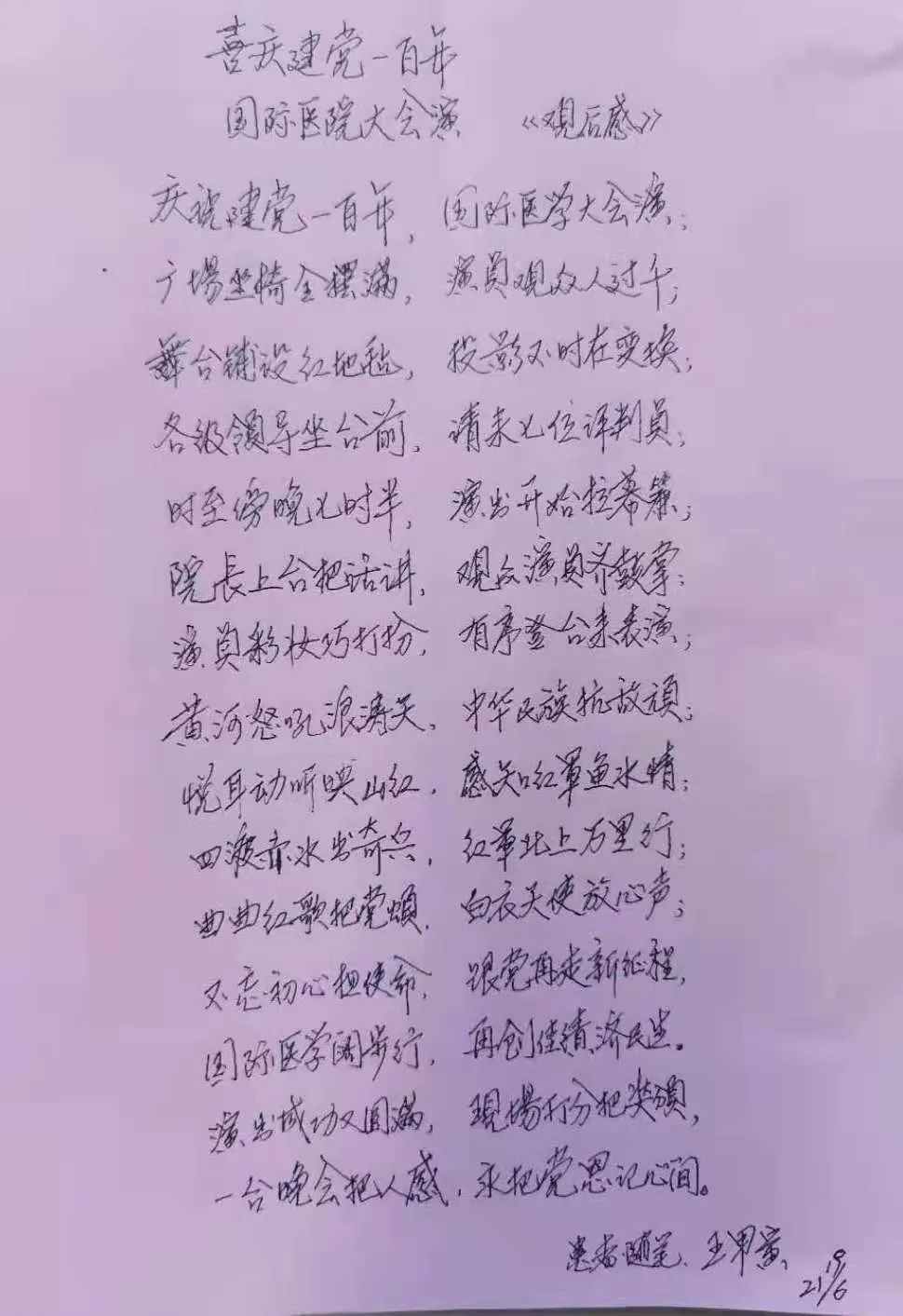 “曲曲紅歌把黨頌,白衣天使放心聲;不忘初心擔使命,跟黨再走新征程;國際醫學闊步行,再創佳績濟民生……” 一位患者在觀看演出后,深情寫下這首《觀后感》,為西安國際醫學中心醫院點贊。