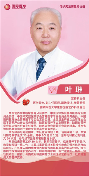 第四軍醫(yī)大學(xué)碩士畢業(yè)后,葉琳進(jìn)入唐都醫(yī)院營養(yǎng)科工作,憑借豐富的臨床經(jīng)歷和積累的營養(yǎng)指導(dǎo)經(jīng)驗(yàn),一步一個(gè)腳印,從普通醫(yī)生做到科主任,一干就是近二十年。葉琳在疾病的飲食調(diào)理和營養(yǎng)治療方面經(jīng)驗(yàn)豐富,尤其擅長糖尿病、脂代謝紊亂、痛風(fēng)、腎功能不全、肥胖、骨質(zhì)疏松等疾病的飲食調(diào)理和危重病人的營養(yǎng)支持。
