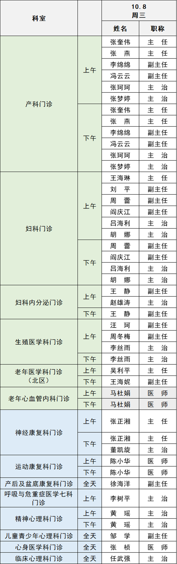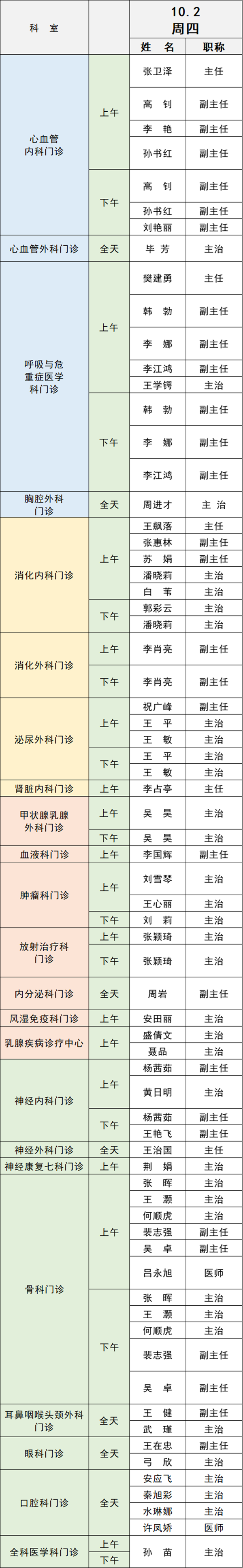 備注:實(shí)際出診情況以醫(yī)院掛號平臺實(shí)時(shí)信息為準(zhǔn)。“職稱”欄里主任=主任醫(yī)師副主任=副主任醫(yī)師主治=主治醫(yī)師